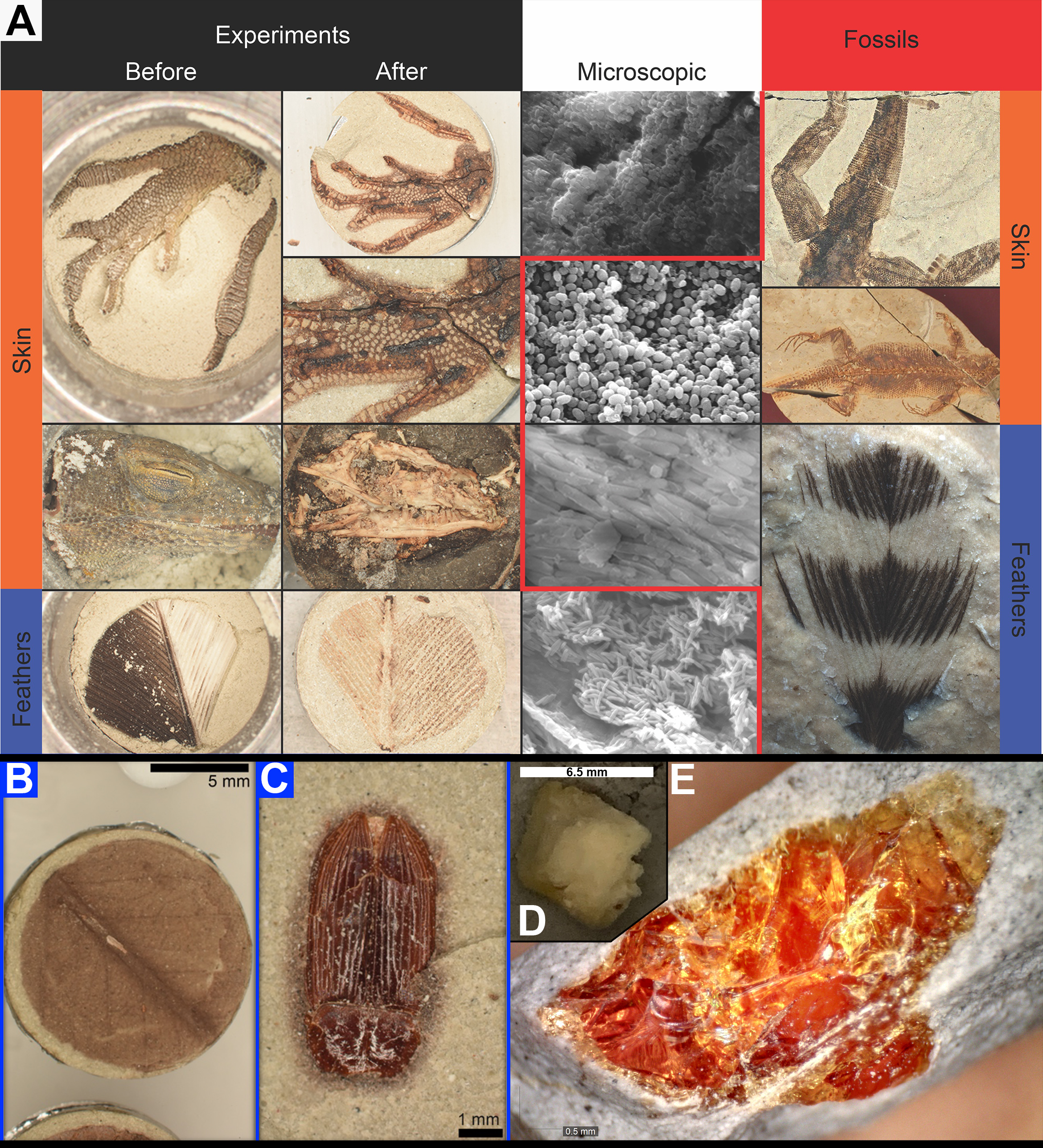 Sediment-encased maturation. A, lizards & feathers before & after maturation compared to fossils macro- & microscopically (electron microscopy), revealing exposed melanosomes. Matured carbohydrate-based tissues (e.g., B, leaves; C, insects) resemble fossils. D, fresh tree resin matured, E, to resemble copal/amber. (Saitta et al. [2019], A–C; Saitta & Kaye [2025], D–E).