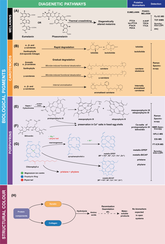 Pigments like melanin, carotenoids, and porphyrins can preserve deep in the fossil record and allow for the reconstruction of color patterns in organisms, such as dinosaurs.