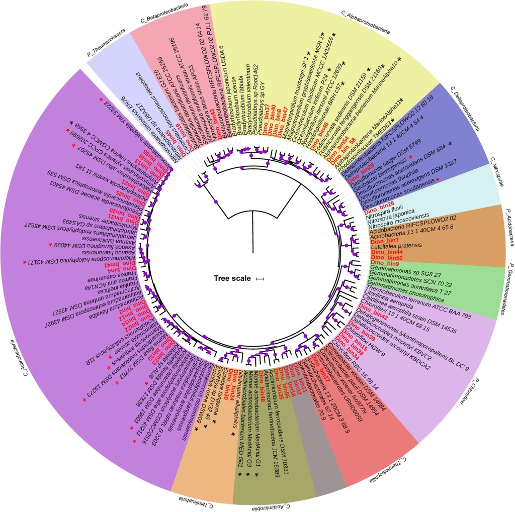 - Novel microbiome within buried dinosaur bone: 46 genomes from six bacterial phyla (Actinobacteria, Proteobacteria, Nitrospira, Acidobacteria, Gemmatimonadetes, Chloroflexi) and one archaeal phylum (Thaumarchaeota), the majority of which represented uncultivated, novel microbial lineages from class to species levels (Liang et al. 2020, Environmental Microbiome).